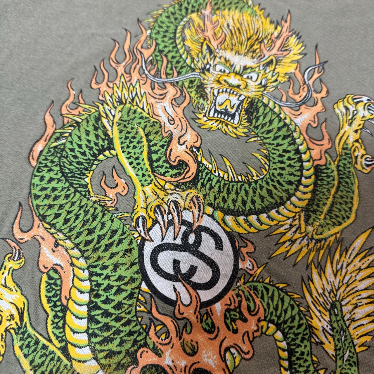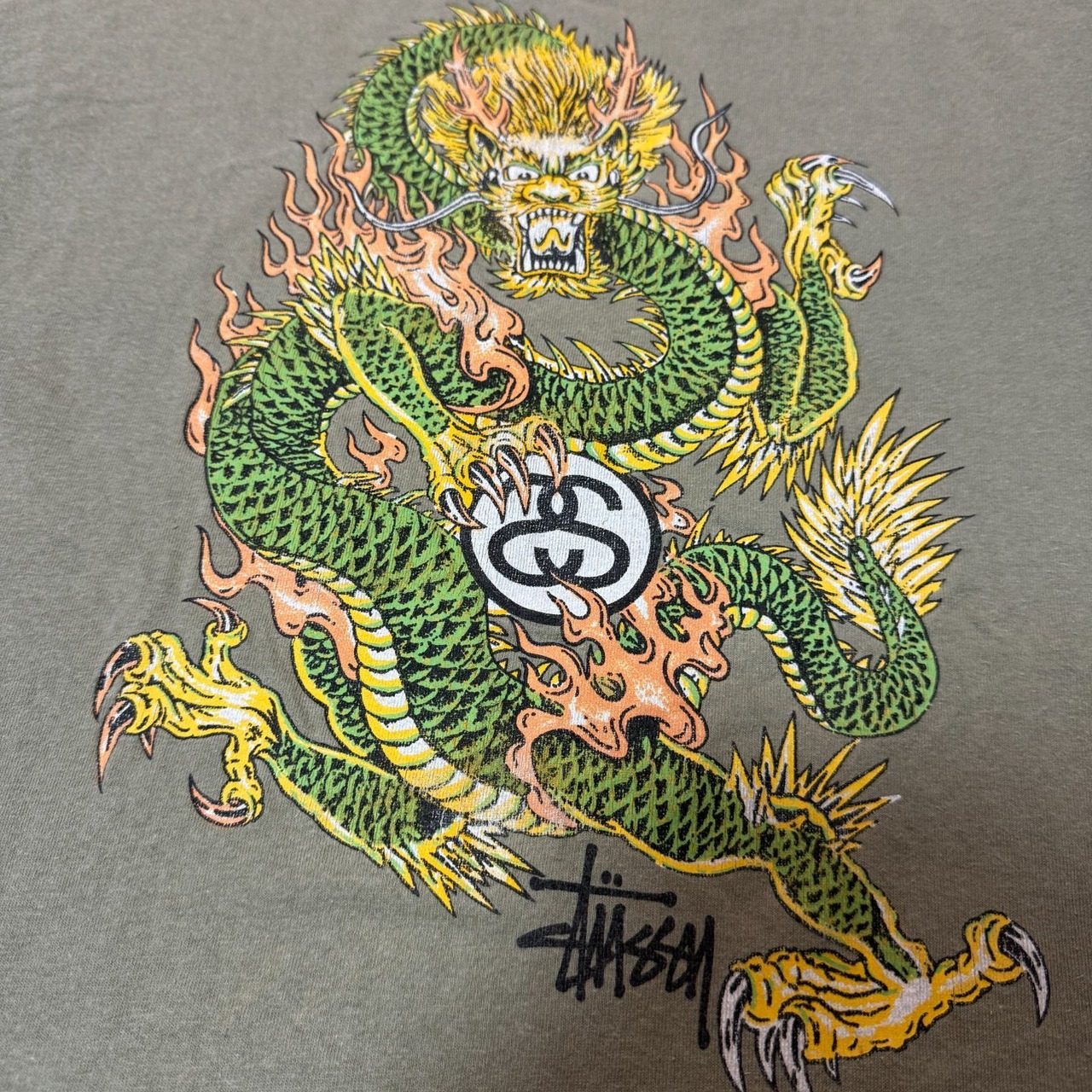 90s STUSSY Tシャツ ドラゴン 龍 Mサイズ カーキ系 神龍 SSロゴ MADE IN USA OLD オールドステューシー Dragon Vintage ヴィンテージ