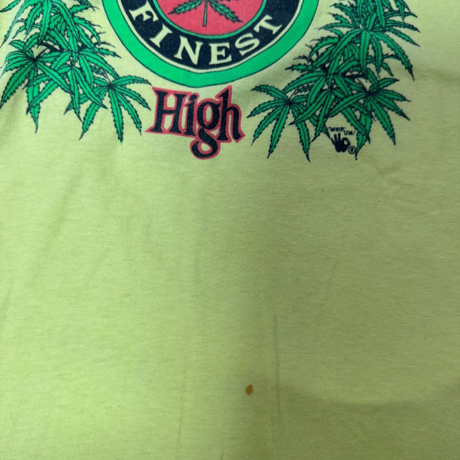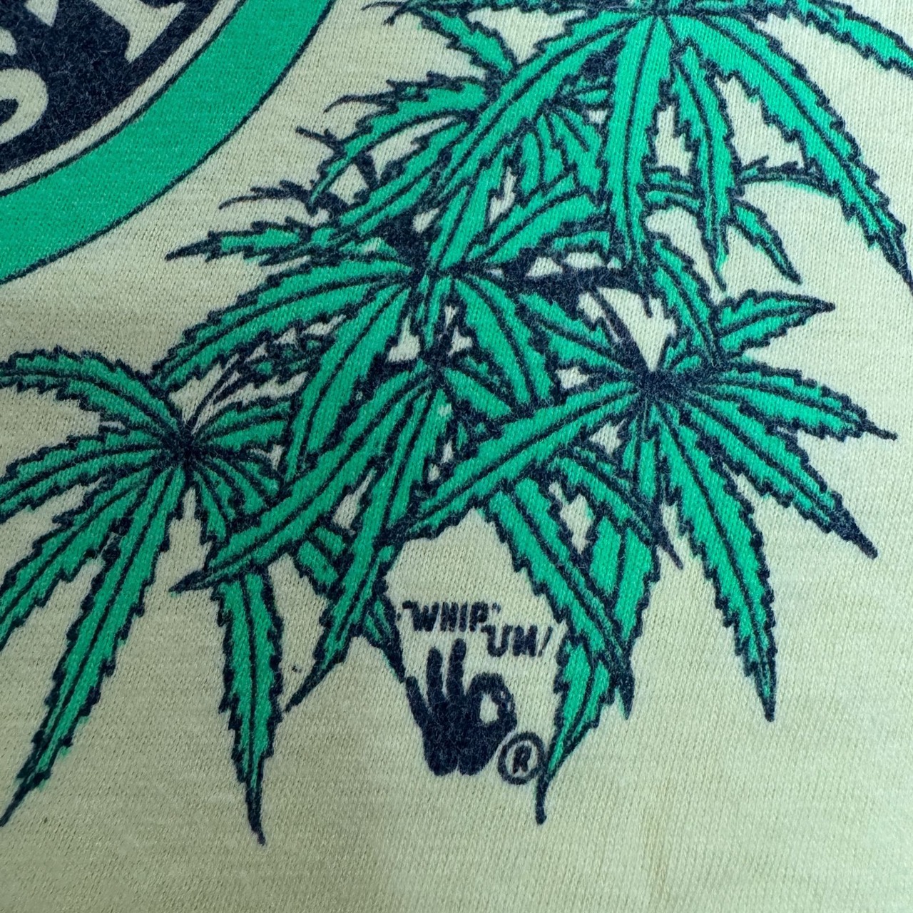 治安悪め、たくさんの葉っぱとなんかのハンドサインがプリントされているTシャツ。
