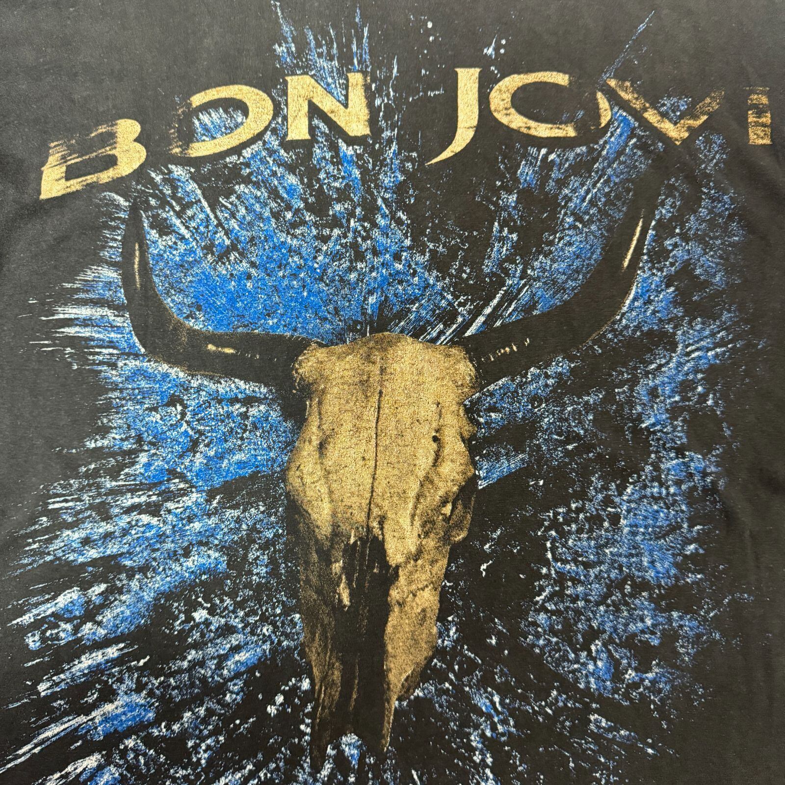 ボーカルのジョン・ボン・ジョヴィが熱唱する姿と牛の頭蓋骨が大判プリントされたインパクト強めのTシャツ。