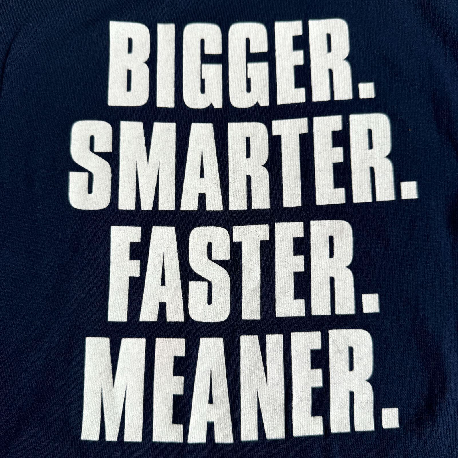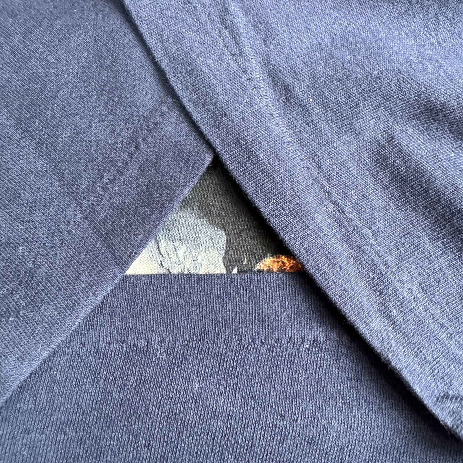 1999年公開のサメ映画『ディープ・ブルー』のプロモーションTシャツです。フロントには巨大なサメに追われるシーンが迫力満点でプリントされ、バックには映画のキャッチコピー「BIGGER. SMARTER. FASTER. MEANER.」が大胆に配置されたインパクトのあるイケている構図。