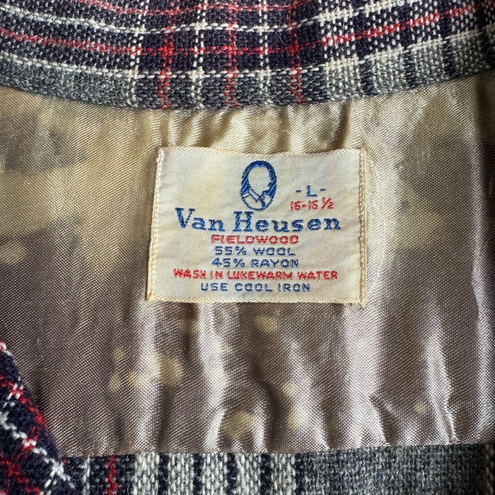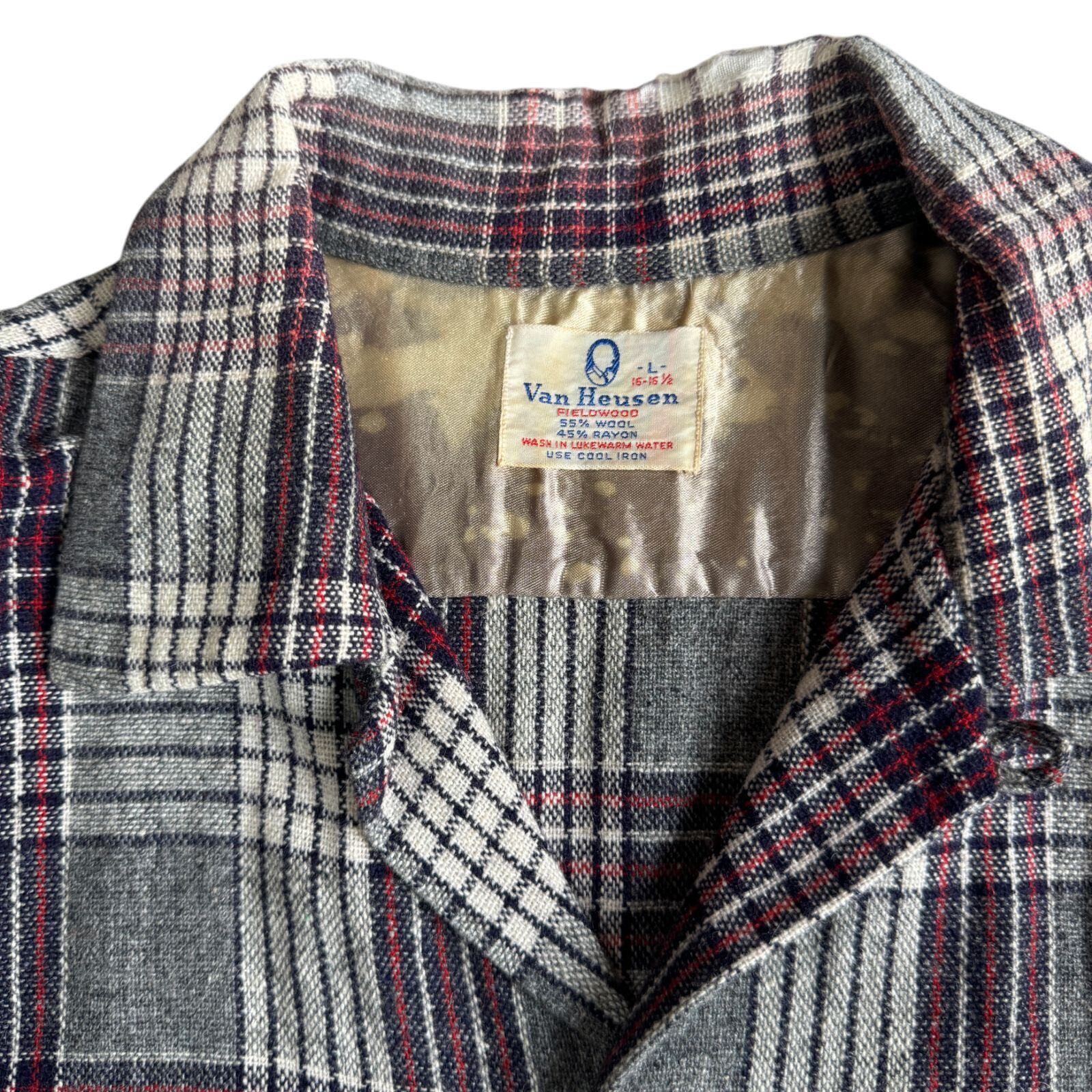 50s - 60s Van Heusen 開襟シャツ ウールシャツ Lサイズ グレー ホワイト シャドーチェック ボックスシャツ Vintage Wool Check Shirt ヴァンヒューゼン ロカビリー メカジ