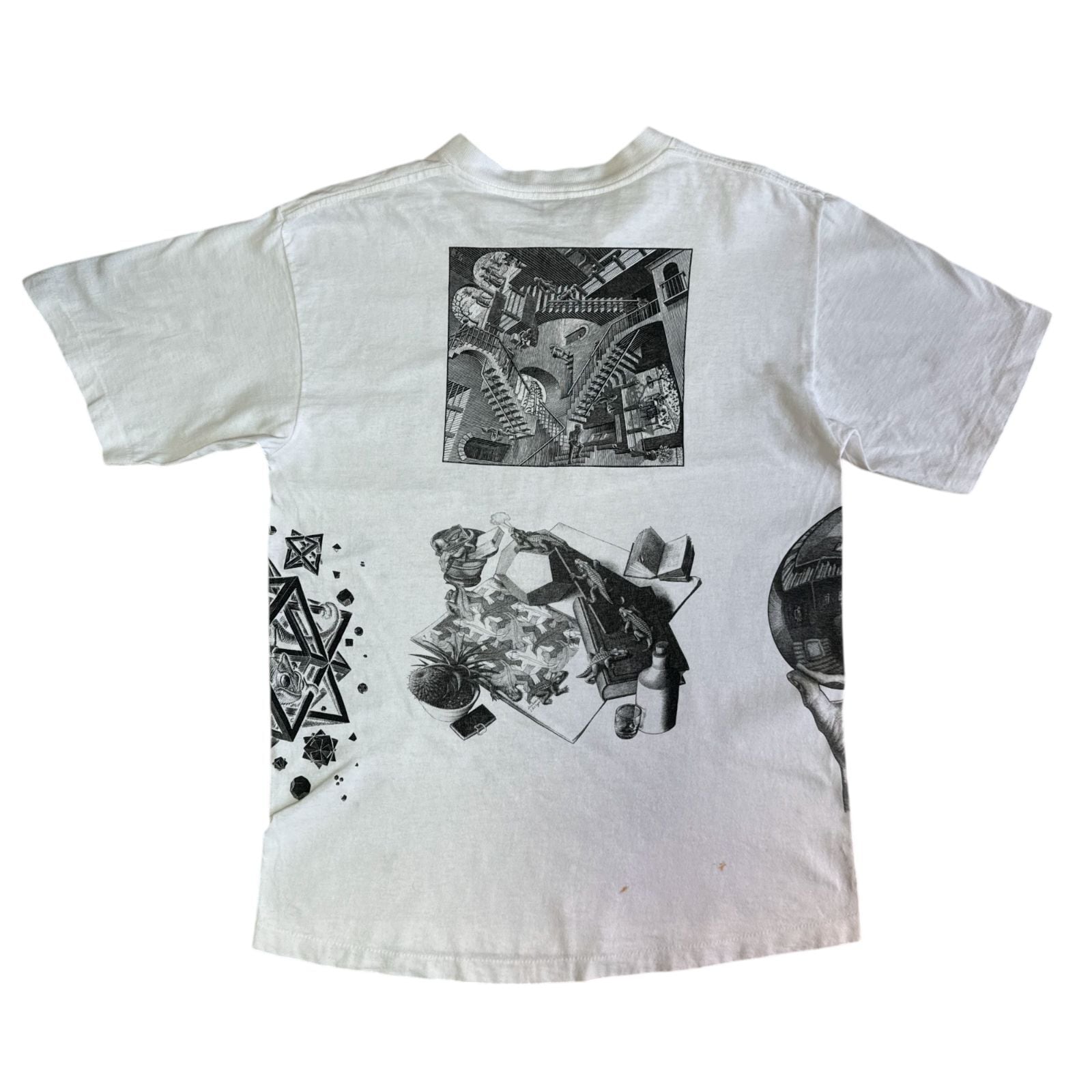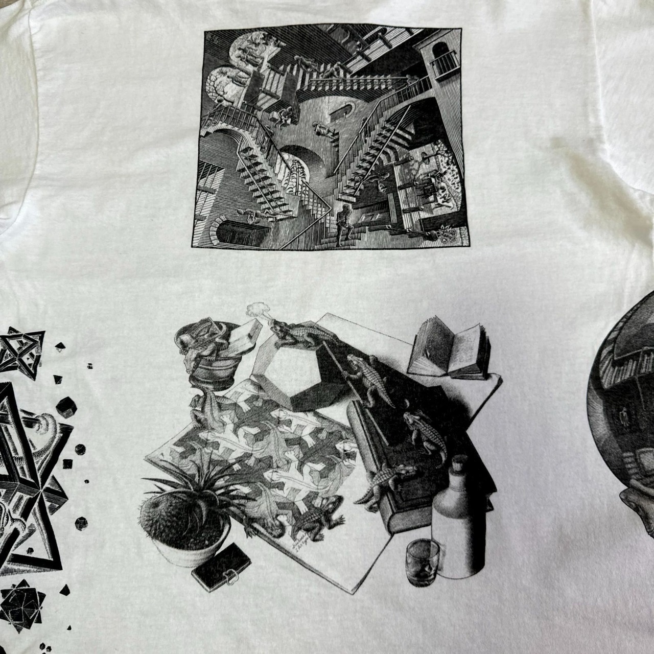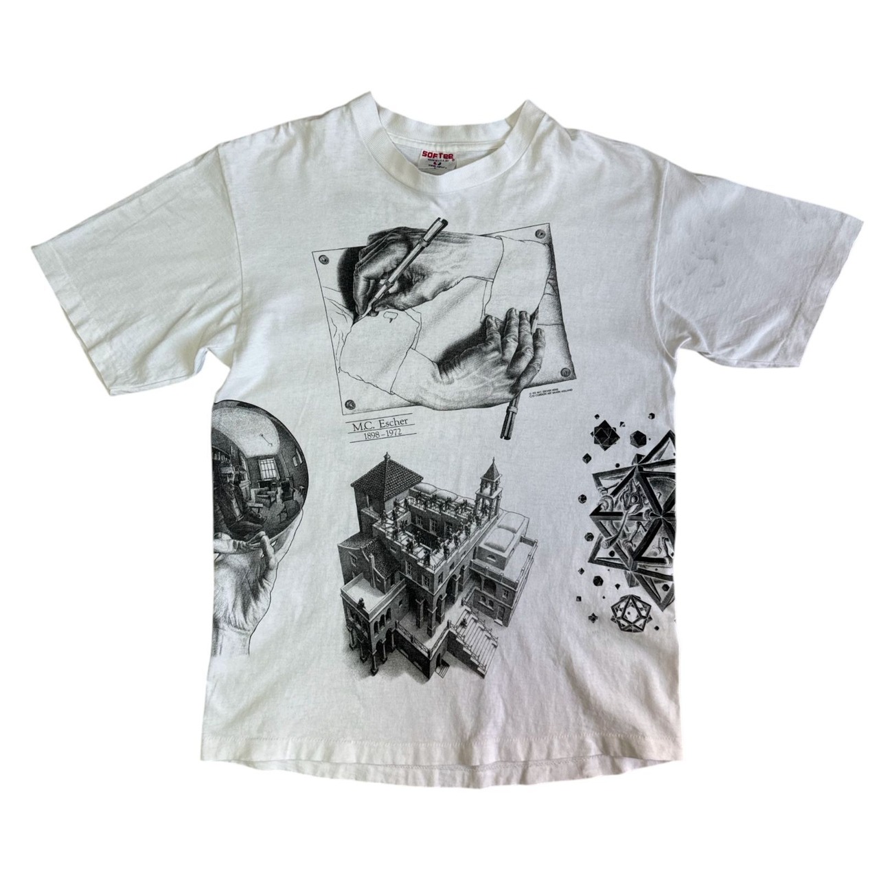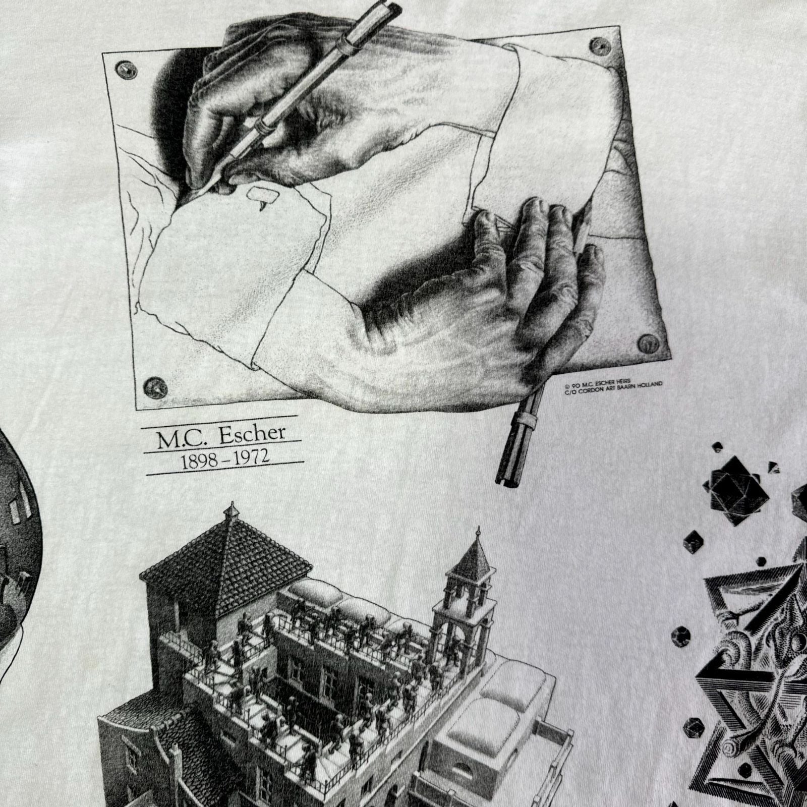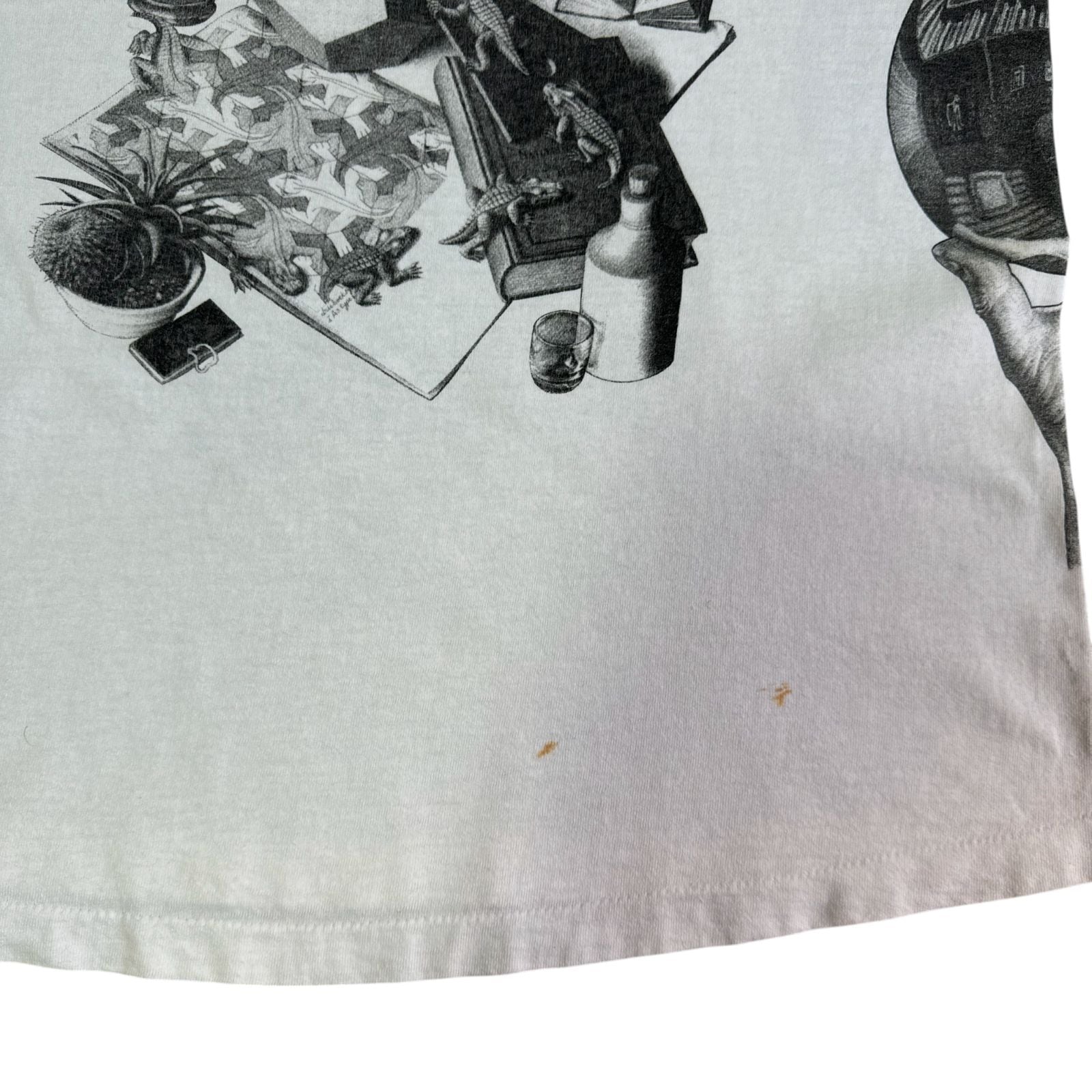 90s M.C Escher アート マルチプリント Tシャツ Lサイズ マウリッツエッシャー 騙し絵 アート プリント Tシャツ Lサイズ アートTシャツ T-shirt Vintage ヴィンテージ ビンテージ 反射する地球儀を持つ手 相対性 描く手