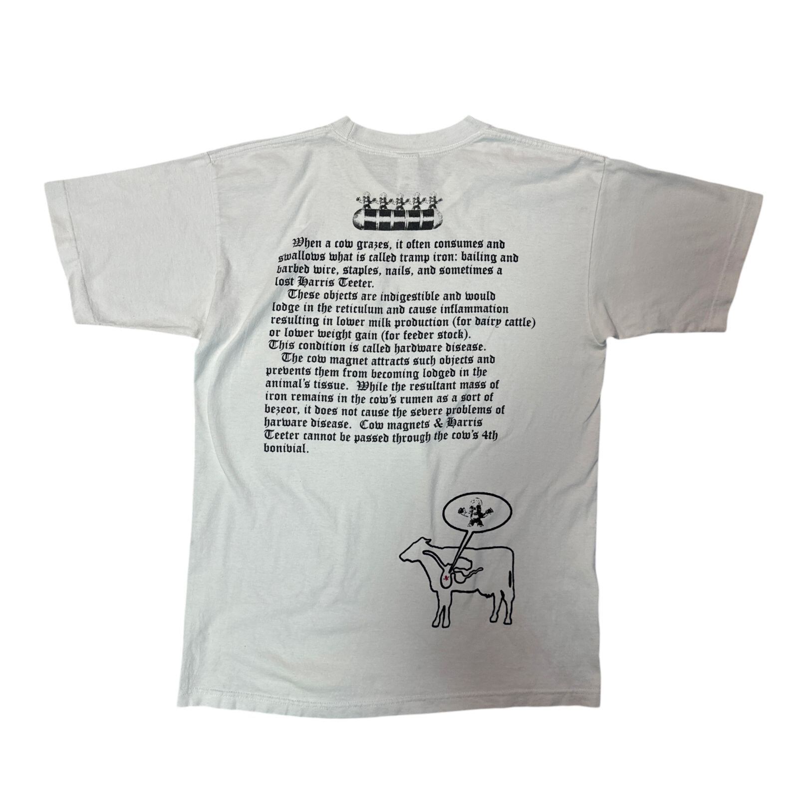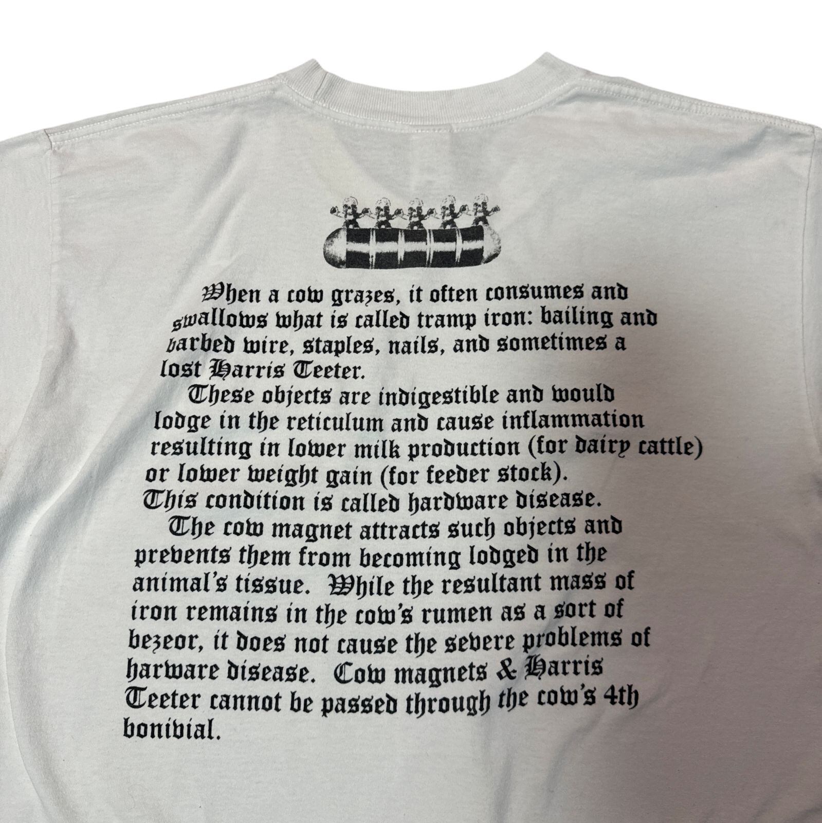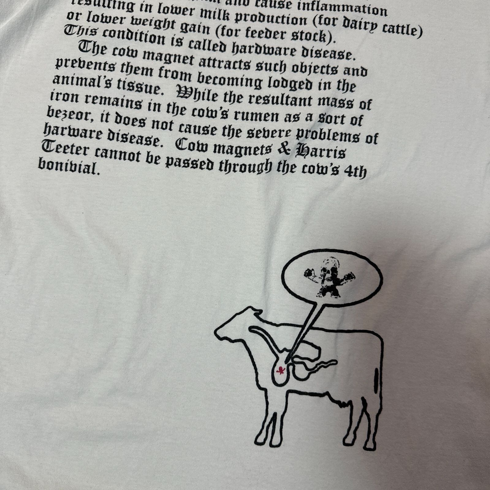 フォティスケルトンは勿論最高なのですが、牛が金属片を誤飲することで起こる 「ハードウェア病」、その治療法として使われるカウマグネットを題材にした、ブラックジョーク溢れるグラフィックが最高すぎる一着です。