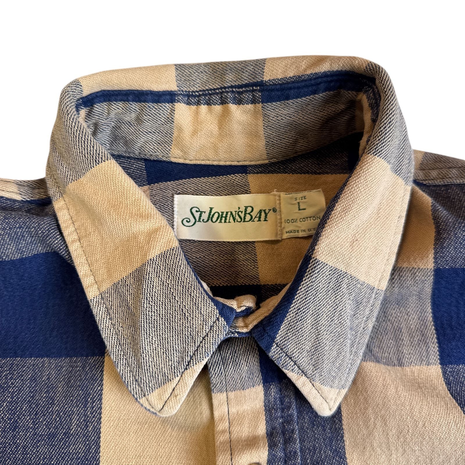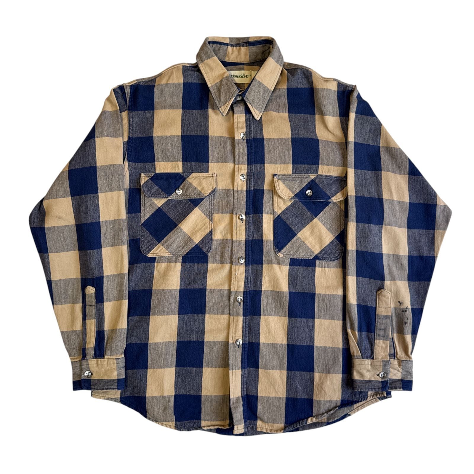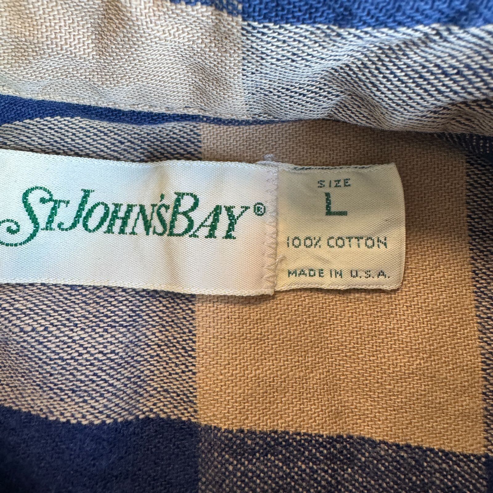 80s ST JOHN'S BAY ヘビーネルシャツ Lサイズ ベージュ ネイビー ブロックチェック ジョンズベイ チェックシャツ フランネル ヘビネル オンブレチェック Vintage ヴィンテージ ビンテージ Flannel Shirt